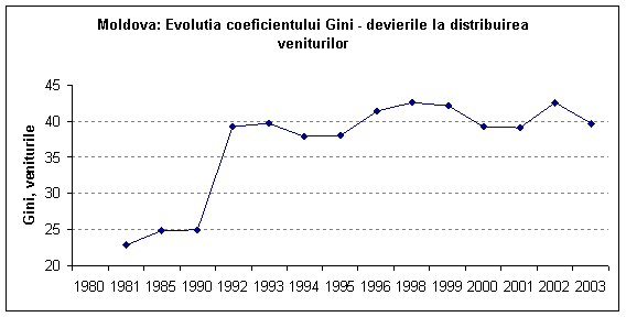 un an din cei trei preconizați pentru implementarea ei expiră. Concomitent, Parlamentul a lansat inițiativa realizării unor reforme de tip nou. Inițial ideea fusese enunțată de către Președintele Voronin cu ocazia sfîrșitul sesiunii de vară (28.07.2004). Ulterior, ea a fost preluată de președintele Parlamentului, Eugenia Ostapciuc, în cadrul deschiderii sesiunii de toamnă a Parlamentului (23.09.2004): "Actualmente este necesar să începem realizarea unor reforme de tip nou, care vor conduce la o dezvoltare mai stabilă și mai durabilă". Pîna în prezent nu au fost făcute publice detaliile referitoare la conținutul și metodele de implementare a reformelor de tip nou. Este corectă aprecierea din declarația președintelui țării referitoare la faptul că reformele trebuie continuate, deoarece "stabilitatea socială și creșterea economică nu au nici o valoare într-un stat sărac". Într-adevăr, începînd cu anul 2000, în Moldova se observă o creștere a PIB-ului (în perioada 2000-2004 creșterea economică a constituit 34%). Însă creșterea s-a produs pe fundalul scăderii (!) ocupării forței de muncă cu 10%. Mai mult, numai 40% au fost obținute în industrie și agricultură. Ponderea cea mai mare s-a datorat sferei serviciilor, creșterii consumului și a impozitelor pe mărfuri și import. O influență semnificativă au avut-o și transferurile de valută ale cetățenilor moldoveni aflați la munci peste hotare. Este evident că o astfel de calitate a creșterii economice nu garantează statului nici dezvoltare stabilă, nici ritmuri rapide ale PIB-ului și nici reabilitarea socială a populației. De la egalitate la inegalitate Afirmația precum că "Moldova este cea mai săracă țară din Europa" a devenit stereotipică. Însă este mult mai important să se menționeze că în nici una din cele 14 țări postsocialiste din Europa Centrală și de Est inegalitatea socială dintre "noii bogați" și "noii săraci" nu a cunoscut o creștere atît de dramatică precum în Moldova. Inegalitatea în veniturile populației din Moldova, exprimată prin indicatorul Gini utilizat de ONU, după 1990 s-a dublat atitngînd nivelul 40-44.