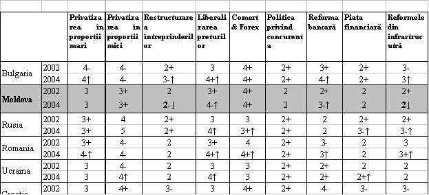 Abordând perspectivele de integrare europeană a RM, este necesar de prognozat real și prețul pe care vom fi nevoiți să-l plătim nu numai în perioada procesului de pregătire, dar și după primirea statutului de membru cu drepturi depline al UE. În toate țările UE 15 prețurile sunt în general aceleași. Cu toate acestea, numai aplicarea unor accize mai mari pentru produsele petroliere, ce este strict controlat, duce la scumpirea serviciilor de transport sau a serviciilor comunale. Cu atât mai mult, conform experienței țărilor UE 12, la introducerea monedei unice europene prețurile se majorează încă cu 20 25%. De aceea la elaborarea Programului de Stat privind realizarea Planului de Acțiuni RM UE (scopurile și termenele realizării acestora intențiile și posibilitățile) este posibil și trebuie de luat în considerație și experiența țărilor UE. Chiar în anii cincizeci, fondatorii Comunității Europene chemau țările europene să refuze proiectele grandioase în favoarea strategiei lucrurilor mai mici. Aceasta poate sta și la baza politicii de integrare europeană a Republicii Moldova. Numai o implicare largă a participanților viabili, cointeresați inclusiv și material, va permite realizarea apropierii cu adevărat eficientă. În cazul dat este foarte important ca consolidarea proceselor de integrare europeană de la bun început să găsească un larg sprijin social atât în procesele democratice cât și în reformele structurale, în construcția statului de drept se implica o parte cât mai mare a populației. Calea spre integrarea europeană va fi activată numai atunci când toți participanții săi - guvernul, mediul de afaceri și societatea civilă sunt pregătiți pentru integrare și aspiră la această integrare. [1] Communication from the Commission to the Council and the European Parliament Wider Europe Neighbourhood: A new Framework for Relations with our Eastern and Southern Neighbours, COM(2003) 104 final [2] Acordul de Cooperare și parteneriat RM UE, articolul 4 [3] Communication from the Commission to the Council and the European parliament Wider Europe Neighbourhood: A new Framework for Relations with our Eastern and Southern Neighbours, COM(2003) 104 final [4] http://www.ebrd.com/pubs/tr/index.htm [5] Valorile indicatorilor sunt prezentate conform unei scări de baluri de la 1 la 4+, unde 1 reprezintă lipsa totală a procesului de reconstrucție a economiei planificate puternic construite, iar 4+ semnifică realizarea standardelor economiei de piață existente în țările industriale dezvoltate. Săgețile indică schimbarea datelor sectoriale. În tabel este utilizată informația Rapoartelor privind procesul de tranziție din 2002 și 2004.