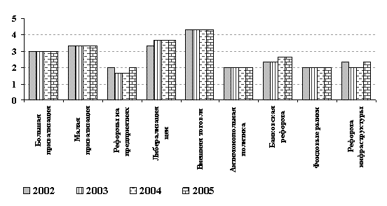 Итак, в 2005 году впервые в истории новой Молдовы правительство отработало - в мире и взаимопонимании с Президентом и Парламентом - полный электоральный цикл и получило мандат на новый четырехлетний срок. Это наше 10-е правительство после 1990 г. и немаловажно, что, по выражению Президента В. Воронина, «нынешний состав правительства пришел не на пустое место, как это было в 2001 году. Почва для плодотворной работы подготовлена».[1] Более того, в заделе у правительства Тарлев-2 имеется весьма весомый пакет среднесрочных стратегий, включая и Стратегию экономического роста и снижения уровня бедности (2004-2006) и План действий Республика Молдова - Европейский Союз (2005-2007). Пока эти документы воспринимаются как декларации о намерениях Правительства по проведению структурных реформ по очень широкому спектру направлений. Однако, можно ожидать, что если эти намерения будут реализованы, то, переводя их в рейтинги оценок по шкале Европейского банка реконструкции и развития (ЕБРР), наша страна может заметно продвинуться вперед в создании надежных предпосылок для устойчивого экономического роста. Пока же, результаты реформ в экономике Молдовы не убедительны. По большинству показателей она, как видно из графика, находиться как бы в «бреющем полете». График: Динамика экономических преобразований в Молдове[2]