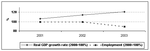 Employment is the Key Issue The economic growth, its quality, rate, parents and sustainability is one of the vexed question today. And it is widely discussed by politicians, economists and journalists. The issues of export-import, migrants’ remittances and others are put on the discussion. However, the key question – employment has remained in the shadow. The problem of labour resources use remains very acute and that why it should be solved urgent. Economic transformations and changes in ownership structure resulted in changes in labour relations and employment sphere. During the first phase of economic reforms the response of Moldovan labour market to sharp decrease in industrial output appeared as average wage cut but not as release labour. So, as compared with 1990, in 1996 the GDP dropped by 63%, amount of wage - by 80%, but the number of employed population – by 20% only. At the same time the king-size shadow economy was created and the unconcealed shadow employment without any legal background or labour contract was in blossom. The fact that economic growth occurred in Moldova during the recent years came to 6-% on annual average has had no evident positive influence on labour market. It is a pity, but economic growth can’t eliminate all social deformations by itself and to belief that it can make this is no more than illusion. And such illusions should be disappeared. In fact, the sizable increase of production had not resulted in job growth but even more the number of employed persons slightly decreased and the number of unemployed went up.