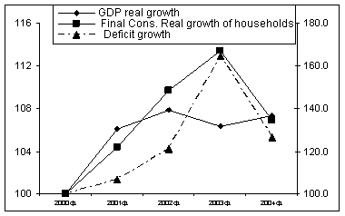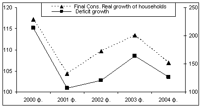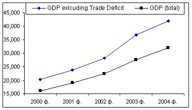 The Government basically agrees with this, having mentioned in EGPRS: “the economic growth that could be observed recently was mainly based on the labor force export. Incomes from the citizens working abroad stimulate internal consumption growth… We are to realize the transition from the model of growth based on the inflow of labor migrants’ incomes and consumption towards the model of balanced growth”. One should not though oversimplify the situation. Our opinion is that the fact per se that the main GDP growth is due to the final consumption growth is not a negative indicator of economic growth. Our goal is to build up a socially-oriented economy and only that model of economic growth that contributes to the growth of welfare of our citizens is acceptable. The point as we see it is different. On the one hand, monetary remittances received by Moldova’s inhabitants from their relatives working abroad lead to the increase of demand for consumer goods and services. The total volume of currency transferred to the country in 2004 is estimated at $1 billion. It is practically equal to 70% of the country’s industrial output, about 100% of agricultural output, about 70% of the total retail trade, including unorganized trade and it is 9(!) times more than the total trade stock. It is obvious that capacities of Moldova’s economy as regards volume, structure and quality of goods and services do not fully allow satisfy this increased consumer demand. Today’s realities are such that huge inflow of currency to the country invariantly causes growth of import. A rather high correlation between the currency inflow increase and the import growth can be observed. Thus, in 2004 currency inflow raised by $300-400 million and import increased by $370 million. Hence, the consumer demand based on the currency transfers from abroad transforms into the demand for import. In this connection, some experts’ assertion seems incorrect that “the major part of these funds is used to pay off trade balance deficit”. They interpret the trade balance as being primary, while the currency inflow from abroad, which forms the demand for import, just defrays the resultant gap. In reality, it is the monetary aggregates transferred from abroad and not unused by the domestic economy that form demand for import and, therefore, conditions on it. Importers forecast solvent demand and direct their steps where there is such demand and it is growing. And this is good. What would inflation and prices in Moldova be if import had not increased over the last 6 years by $700 million?